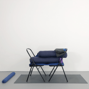 Fold a yoga mat in half, and drape the mat over the seat of both chairs. This will help to link the chairs together and prevent them from sliding apart.