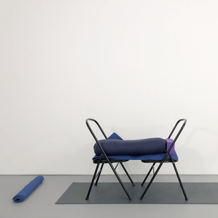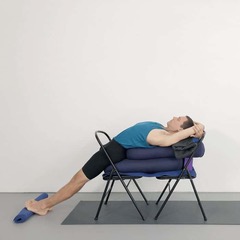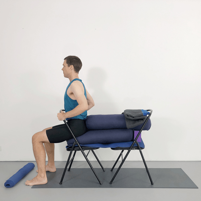 Before lying back over the chairs, prepare a support for the balls of your feet. A rolled yoga mat is ideal for this purpose, but other nearby objects will do in a pinch. Anticipate how far this foot support will need to be away from the chair, and place it in position.